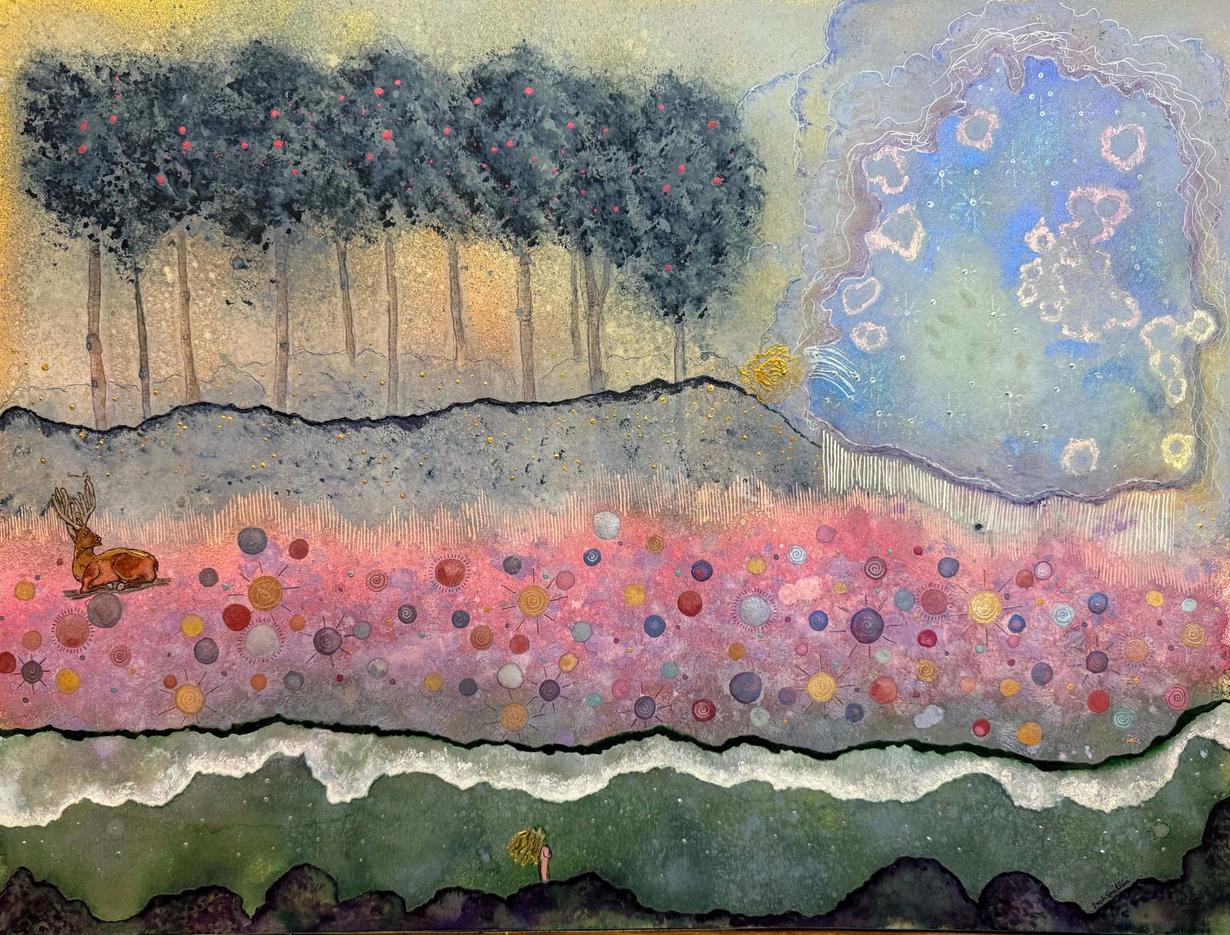 For this El Duende project, I decided to go back to my roots: mixed-media with a strong watercolor component. Rather than working with the whole canvas each week and painting over prior elements, I felt called to focus on details, slowly working around the whole piece.